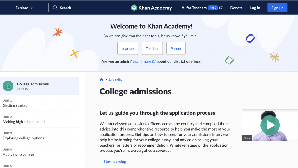 - Course Link: https://www.khanacademy.org/college-careers-more/college-admissions