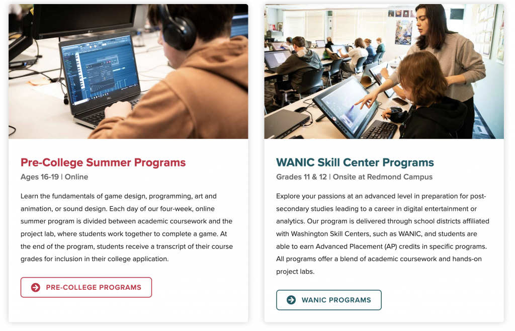 Located in Redmond, DigiPen Institute of Technology provides summer workshops in game development, computer engineering, animation, and more. These workshops focus on practical education to enhance technical skills and deepen understanding of related fields.